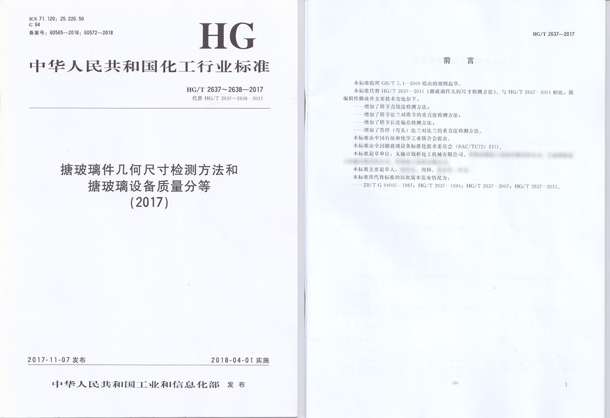 無(wú)錫錢(qián)橋化工機(jī)械有限公司參與起草中華人民共和國(guó)化工行業(yè)標(biāo)準(zhǔn)HG/T 2637~2638-2017《搪玻璃件幾何尺寸檢測(cè)方法和搪玻璃設(shè)備質(zhì)量分等》。
