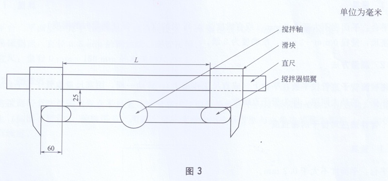 將待測(cè)攪拌器放平,如圖3所示,將直尺的兩個(gè)滑塊卡在攪拌器的兩個(gè)錨翼上,在直尺上讀出滑塊兩端的長度L,則攪拌器錨翼寬度值為L+120 mm,取3次測(cè)量的平均值與攪拌器標(biāo)準(zhǔn)寬度之差的絕對(duì)值作為攪拌器錨翼寬度與標(biāo)準(zhǔn)寬度的偏差。
