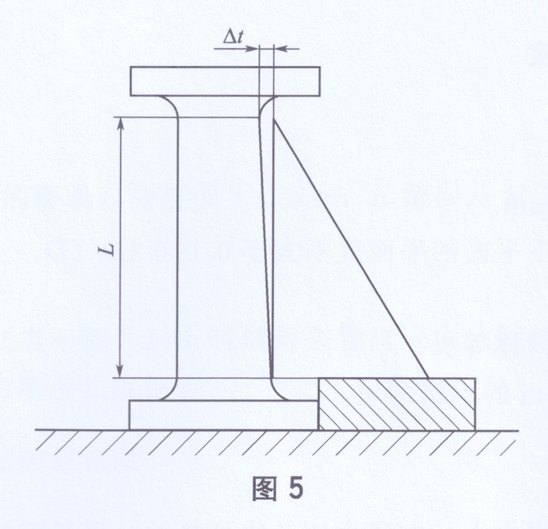 將被測管子法蘭端放置在平臺上,在緊靠法蘭邊處墊放一平行度標準圓墊塊,用直角尺貼靠在管壁上(如圖5所示),旋轉管子,用塞尺量取旋轉一周中管子上端與直角邊的最大距離△t,此值即為管件法蘭對管子的垂直度。