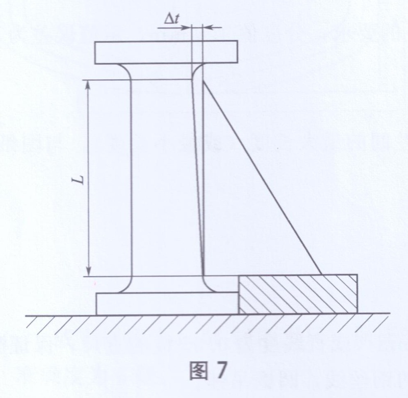 將被測塔節(jié)法蘭端放置在平臺上,在緊靠法蘭邊處墊放一平行度標準圓墊塊,用直角尺貼靠在塔節(jié)壁上(如圖7所示),繞塔節(jié)軸線旋轉(zhuǎn)平行度標準圓墊塊和直角尺,用直尺景取旋轉(zhuǎn)一周中塔節(jié)做體外壁與直角邊的最大距離△t,此值即為塔節(jié)法蘭對塔節(jié)的垂直度。