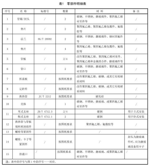 碳化硅換熱器結構型式見圖1,零部件明細表見表1,換熱器主要尺寸標注圖見圖2,主要尺寸表見表2,管口尺寸表見表3,換熱器(換熱管外徑為Φ14 mm)的布管數(shù)及換熱面積表見表4,換熱器(換熱管外徑為Φ19 mm)的布管數(shù)及換熱面積表見表5。