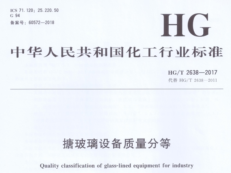 2021-04-23HG/T 2638—2017搪玻璃設(shè)備質(zhì)量分等。1、搪玻璃設(shè)備質(zhì)量分等范圍:本標準規(guī)定了攜玻璃設(shè)備質(zhì)量分等的方法和要求。本標準適用于設(shè)計壓力小于等于1.0MPa,沒計溫度高于-20 ℃至200℃ 的搪玻璃設(shè)備及部件的質(zhì)量分等。