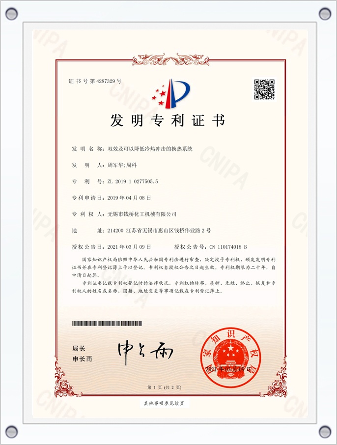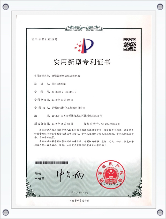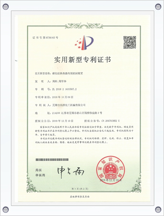 碳化硅換熱器外側(cè)密封裝置專利證書