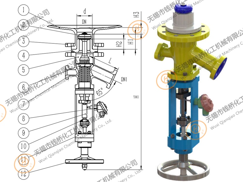 搪玻璃上展式手動放料閥 *內置測溫手動放料閥。閥門采用無間隙結構, 波紋填料密封和閥芯緊密裝配,減少泄露的可能。閥芯內可以安裝溫度傳感器,檢測物料溫度。該閥門通過手輪手動操作開關閥門。