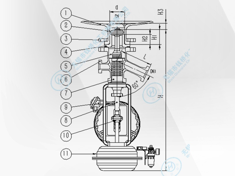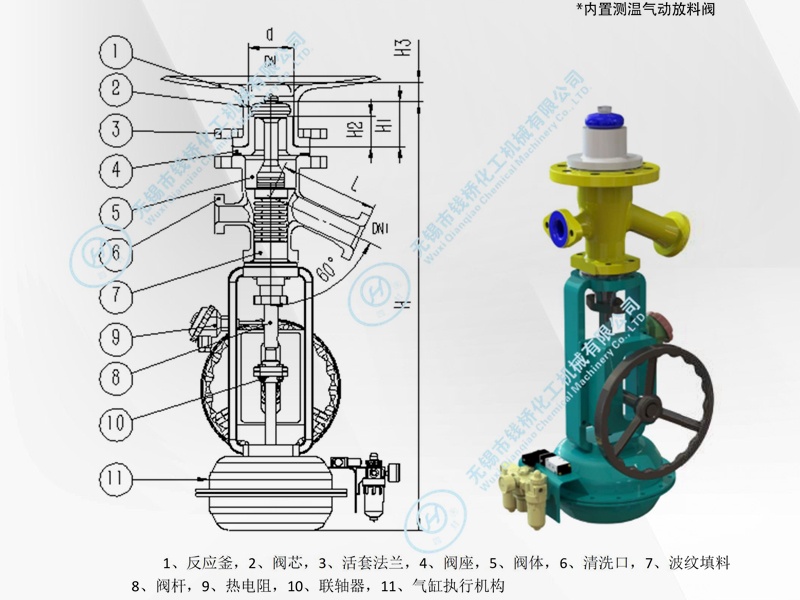 搪玻璃上展式自動放料閥【氣動閥門】工作溫度:-19°C~200°C(耐溫急變小于 120°C);工作壓力:-0.1MPa~1.0MPa